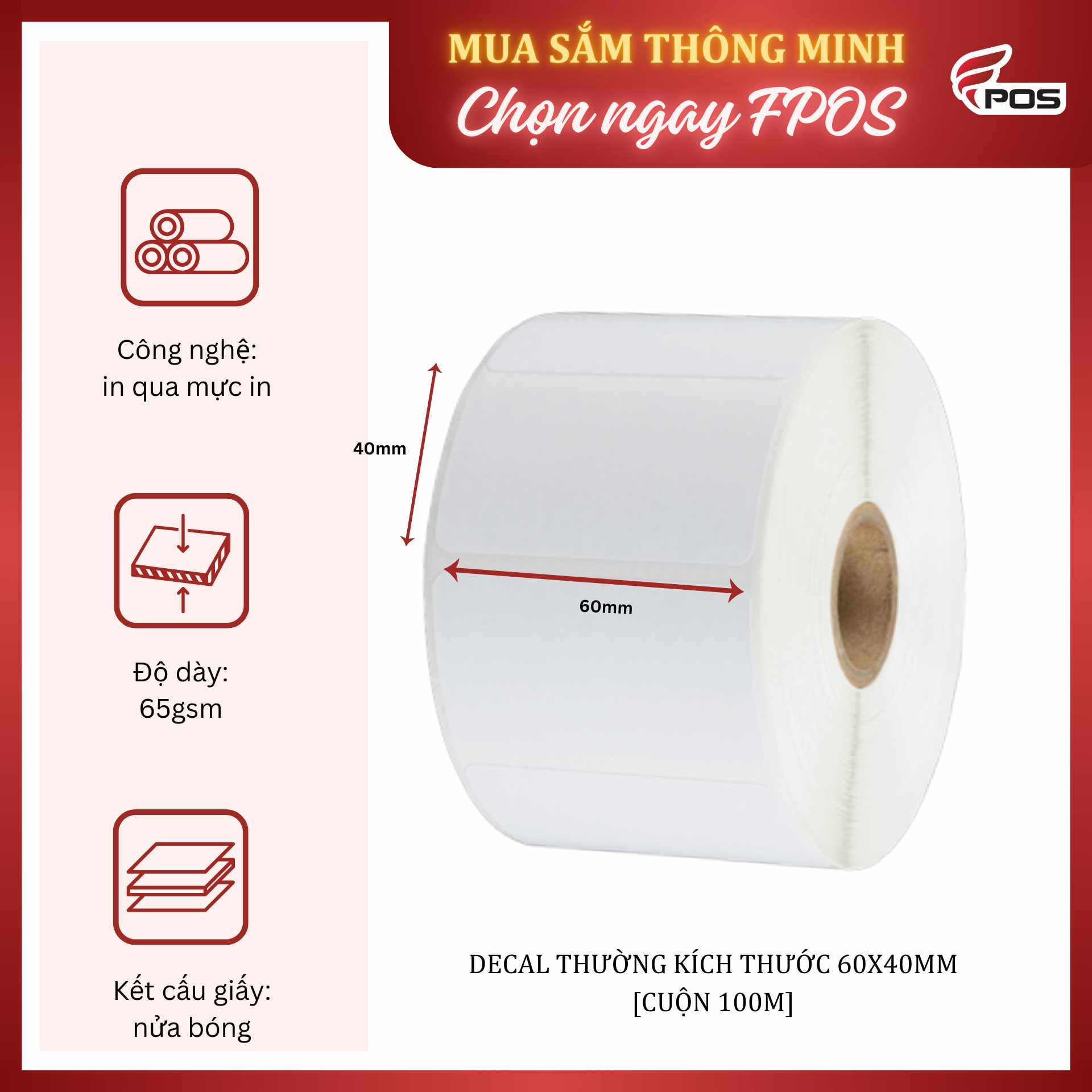 Giấy decal nhiệt 60×40mm là loại giấy cảm nhiệt trực tiếp (direct thermal) chuyên dùng cho các máy in sử dụng ribbon mực. Với kích thước tem 60mm (ngang) x 40mm (cao) và chiều dài cuộn 100m, sản phẩm phù hợp để in tem nhãn mã vạch, thông tin sản phẩm, tem vận chuyển, tem giao nhận… tiện lợi và tiết kiệm.